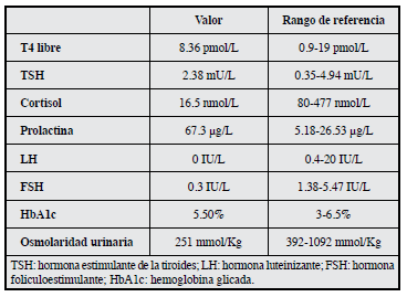 Debido al compromiso hipofisiario, se realizó perfil hormonal que arrojó los resultados mostrados en la Tabla 1, con una función renal y electrólitos (incluyendo magnesio y calcio) dentro de parámetros de normalidad. Ante la sospecha de diabetes insípida se realizó test de desmopresina evaluando la osmolaridad urinaria basal (Tabla 1) y 12 horas posteriores a su administración, la cual fue de 734 mmol/Kg (392 - 1092 mmol/Kg). Determinándose con los hallazgos de laboratorio e imagenológicos un panhipopituitarismo (hipotiroidismo central, hipogonadismo central, hipocortisolismo a pesar de suplencia con dexametasona de manera intrahospitalaria y diabetes insípida) asociado a hiperprolactinemia compresiva. Se le inicio suplencia con levotiroxina 75 μg/día y desmopresina 10 μg 1 puff nasal cada 12 horas.