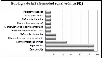La principal causa de enfermedad renal crónica en nuestros pacientes fue nefropatía hipertensiva en 28% seguida de nefritis intersticial crónica (12.4%), 28% de los casos fueron de etiología desconocida (Figura 1).