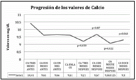 Se realizó comparación de los valores bioquímicos un mes antes del procedimiento quirúrgico, con los valores obtenidos a los tres, seis, nueve y 12 meses post operatorios. Encontramos diferencias estadísticamente significativas en los valores de calcio medidos un mes antes del procedimiento quirúrgico y los meses tres y nueve post operatorios (p= 0.038 y 0.022 respectivamente) (Figura 2).