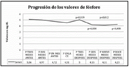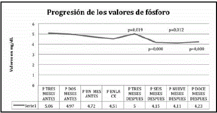 Hubo además diferencias estadísticamente significativas entre el valor de fósforo un mes antes de la cirugía y los meses tres (p=0.019), seis (p=0.008), nueve (p=0.012) y 12 (p=0.008) post operatorios, al igual que en los valores del producto calcio x fósforo (p=0.001, 0.009- 0.003- 0.001 respectivamente) (Figuras 3 y 4).