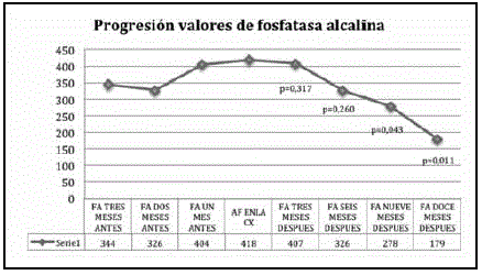 En los valores de fosfatasa alcalina se observa un ascenso progresivo desde tres meses antes de la cirugía hasta el momento del procedimiento, y posterior a la cirugía con descenso progresivo hasta el año de seguimiento. Hubo diferencias estadísticamente significativas entre el valor un mes antes de la cirugía y los valores a los nueve (p=0.043) y 12 (p=0.011) meses post operatorios (Figura 5).