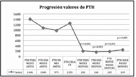 El valor medio de PTH tres meses antes de la cirugía fue de 1406 pg/dL, con un valor máximo de 2500 pg/dL. La media de PTH a los 12 meses de seguimiento fue de 249 pg/dL, con una mínima de 3 pg/dL y una máxima de 1016 pg/dL. Al comparar los valores de PTH un mes antes de la cirugía con los tres, seis, nueve y 12 meses postquirúrgicos, hubo diferencias estadísticamente significativas con todos ellos, con valores de p < 0.0001 en todos los casos. El descenso más marcado se observa a los tres meses luego del procedimiento, manteniéndose estable durante los 12 meses siguientes (Figura 6).