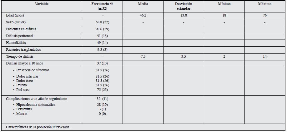 Resultados: se incluyeron 32 pacientes, 68.8% mujeres, con media de edad de 46.2 años. Se identificaron diferencias estadísticamente significativas en el cambio en los valores de calcio, fósforo y PTH pre y post quirúrgicos. El 81.5% de los pacientes reportaron presencia de síntomas. El 34.6, 26.9, y 23% presentaron mejoría total de dolor óseo, dolor articular y prurito, respectivamente. El 28% presentaron hipocalcemia sintomática post operatoria. No hubo casos de muerte durante el seguimiento.