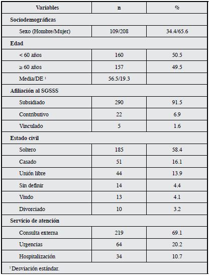 Se obtuvo una muestra representativa de 317 pacientes con al menos una prescripción de IBP en los servicios de consulta externa, urgencias u hospitalización del hospital, de los cuales 208 pacientes eran mujeres (65.6%). Las principales características sociodemográficas se describen en la Tabla 1.