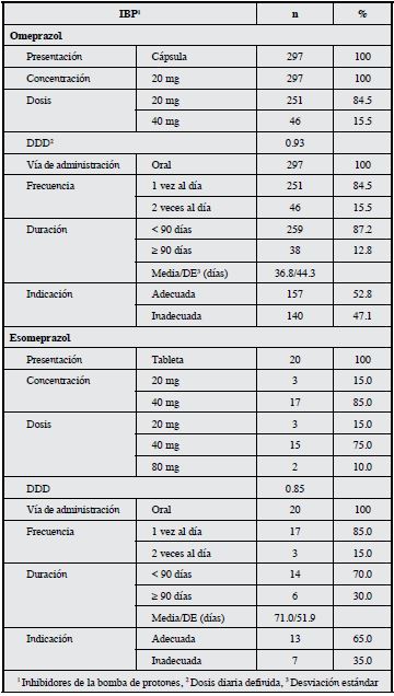 Se presentó una prescripción inadecuada de IBP en 147 pacientes (46.3%) del total de la muestra, de los cuales 95.2% tenían prescrito omeprazol y el restante esomeprazol.