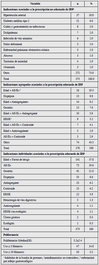 Methods: study of prescription-indication in patients older than 18 years with formulation of a PPI attended at the San Pedro and San Pablo Hospital of La Virginia, Risaralda, between July 1, 2016 and July 31, 2017. A proportional simple random sample was obtained. The clinical histories were used as a unit of analysis. Sociodemographic variables, comorbidities, prescription-indication patterns and polypharmacy were included. Adequate prescription-indication of PPI was defined according to the latest available scientific evidence. Epiinfo 7.2 was used to perform descriptive statistics, X2 and a binary logistic regression (P <0.05). For the cost analysis, reference cost per unit of IBP and DHD x 1000 inhabitants/day was defined. It had bioethical approval.