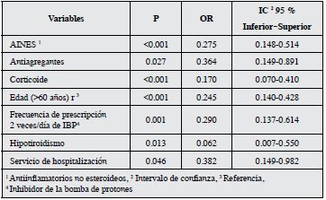 Se encontraron ocho variables (edad > de 60 años, hipotiroidismo, corticoide, antiagregantes, AINEs, anticoagulante, frecuencia (2 veces/día), hospitalización) que presentaron asociación estadísticamente significativa con una reducción de la probabilidad de presentar prescripción inadecuada de IBP; no se presentaron variables con asociación que aumentarán la probabilidad de presentar prescripción inadecuada en la población.