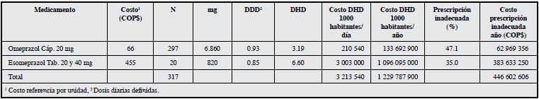 Resultados: se analizaron 317 pacientes de los cuales 65.6% eran mujeres. El omeprazol fue el IBP más frecuente prescrito (93.7%). Se presentó una prescripción inadecuada en el 46.3% de los pacientes, siendo el servicio de urgencias el que mayor prescripción inadecuada presentó (53.1%). Los principales diagnósticos asociados a la indicación no adecuada de IBP fueron la hipertensión arterial (10%) seguido de la diabetes (6.0%). Siete variables se asociaron con una mayor probabilidad de presentar una prescripción adecuada de un IBP. El costo anual estimado por prescripción inadecuada de IBP fue de COP $446 602 606 DHD x 1000 habitantes/año.