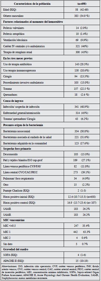 Resultados: de 775 reportes de hemocultivos positivos para S. aureus, finalmente se ingresaron 698 pacientes al estudio. La mediana de edad fue de 58 años (RIQ=42-69), 383 eran hombres (54.9%). En 354 pacientes (50.7%) la bacteriemia era de origen nosocomial y el 26.2% (n=183) eran SAMR. En 123 (17.6%) bacteriemias adquiridas en la comunidad, la frecuencia de SAMR fue 33.3% (n=41). El antecedente más frecuente fue tener un catéter vascular en 321 pacientes (46%). Se inició terapia empírica en 67.2% de los casos (n=469). Respecto a la gravedad, la mediana del puntaje SOFA fue de 4 (RIQ=1-5), APACHE II de 15 (RIQ=10-19) y la mortalidad fue del 24.9% (n=174).