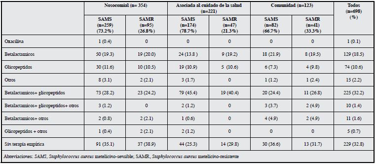 Se inició terapia empírica en el 67.2% de los casos (n=469), en la Tabla 2 se muestra en detalle la terapia empírica administrada, dividida en seis grupos según el origen de la bacteriemia (nosocomial, intermedia, de la comunidad) y su resistencia (SAMR y SAMS).