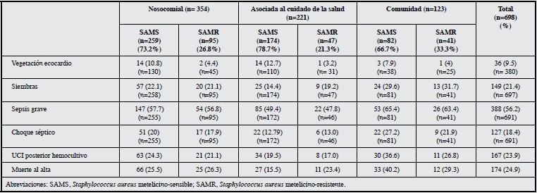 En una cohorte de pacientes con bacteriemia por S. aureus en un hospital universitario de referencia en una ciudad capital, más del 80% de las mismas fueron de origen nosocomial o asociadas al cuidado de la salud; sin embargo, el aislamiento más frecuente fue el SAMS en todos los subgrupos. La mayor mortalidad se observó en los pacientes con bacteriemia adquirida en la comunidad y particularmente en aquellos infectados con SAMS.