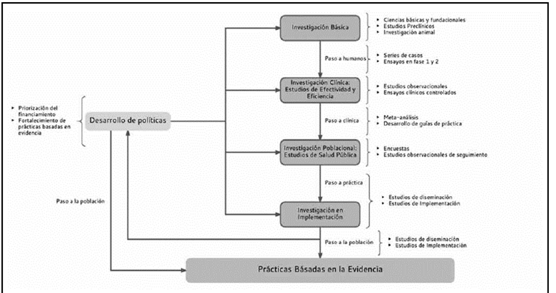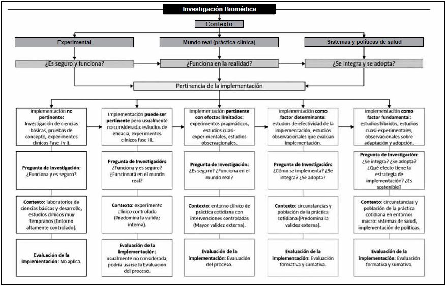 Sin embargo, a pesar del creciente volumen de información y conocimiento generado por la investigación clínica, llevarlo a la práctica clínica de forma efectiva, es un aspecto que la propia investigación clínica no resuelve, dado que su objetivo principal, es generar conocimiento bajo las circunstancias propias del diseño epidemiológico, mas no necesariamente transferir el conocimiento de los resultados a entornos de práctica real 9, por tanto, uno de los retos más grandes que enfrentan actualmente los sistemas de salud, es dilucidar el mejor método para identificar intervenciones con eficacia demostrada y aplicarlas en la práctica real 10. A lo cual se suma, la necesidad de desarrollar investigaciones que sustenten los procesos decisorios en salud y la exigencia de ejecutar investigaciones promovidas por la demanda de servicios 11, es decir, establecer los factores contextuales que influyan en los efectos y resultados de las intervenciones.