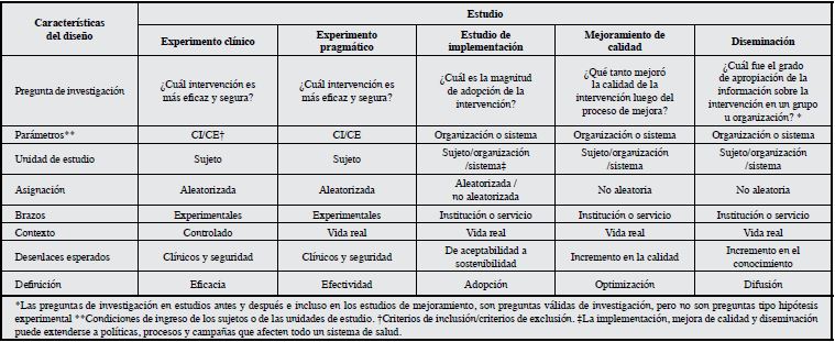 Mientras que la distinción entre la implementación y los demás tipos de estudios puede ser clara, vale la pena recalcar que en la práctica estas diferencias deben ser definidas desde el diseño del estudio, de tal modo que la generación de hipótesis y la metodología empleada, sea la adecuada para la medición de los desenlaces de interés 38.