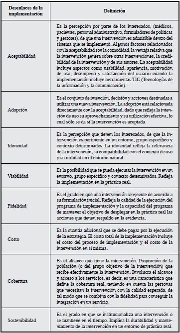 El desenlace de la implementación tiene como función servir como un indicador del éxito de la implementación, ser el indicador del proceso de implementación y ser el intermediario entre los desenlaces clínicos y la valoración de la calidad del cuidado 56. Las medidas de desenlace de los estudios de implementación se resumen en la Tabla 2.