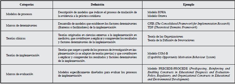 Se han propuesto tres bases fundamentales sobre las cuales se fundamenta la investigación en implementación. La primera, es el conjunto de marcos o modelos que describen cuál es la mejor estrategia de implementación de acuerdo con el contexto de la práctica. La segunda base implica, el marco explicativo necesario para comprender los resultados de la implementación y la tercera base es el modelo o marco que evalúa la implementación 58. A partir de estas bases se distinguen diversas categorías de modelos y teorías que abarcan los procesos de desarrollo de la implementación.