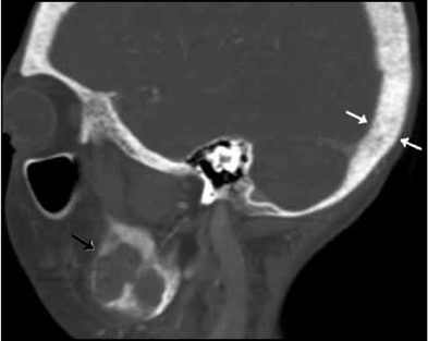 En radiografía convencional los tumores pardos se presentan como lesiones líticas, únicas o múltiples, expansivas, de bordes bien definidos y localización variable (esqueleto axial o apendicular) 15. En TC se caracterizan por lesiones líticas, centrales o excéntricas, que en ocasiones se asocian a masa de tejido blando 16,17. Las calcificaciones son evidentes en la TC como múltiples áreas densas 13.