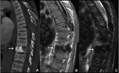 La apariencia de los tumores pardos en RM depende de su composición. Las lesiones sólidas son hipointensas en las imágenes potenciadas en T1 y T2, con realce posterior a la administración de gadolinio. Los tumores que presentan áreas quísticas son hiperintensos en las secuencias potenciadas en T2 y pueden presentar niveles líquido-líquido secundarios a sangrado y efecto paramagnético relacionado con la presencia de hemosiderina. Este hallazgo es inespecífico y se presentan en otras lesiones como quistes óseos aneurismáticos y tumores de células gigantes 13,18.