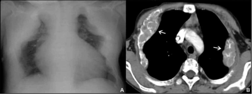 Paciente masculino de 20 años con antecedente de mucopolisacaridosis y distrofia renal. ERC de larga evolución, con manejo inicial de TRR (diálisis peritoneal) y trasplante renal de donante cadavérico, que cursó con rechazo y pérdida del injerto, para retornar a diálisis peritoneal y posteriormente hemodiálisis. Presentó hiperparatiroidismo severo con PTH de 3259 pg/mL, que requirió paratiroidectomía en agosto de 2017. La radiografía de tórax previa a la paratiroidectomía evidenció masas dependientes de la pared costal. La TC de tórax confirmó la presencia de lesiones líticas expansivas de las costillas, de aspecto benigno, compatibles con tumores pardos (Figura 4).