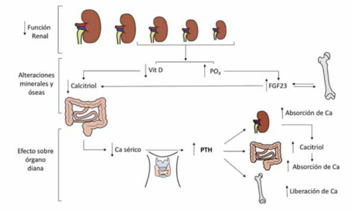 Con la disminución de la función renal se deteriora progresivamente la homeostasis mineral, con variación en las concentraciones séricas de fósforo, calcio y cambios en los niveles séricos de hormona paratiroidea (PTH), vitamina D, factor de crecimiento fibroblástico 23 (FGF 23) y hormona del crecimiento. El resultado final es hiperparatiroidismo secundario con alteraciones en la formación mineral y aumento de la fragilidad ósea.