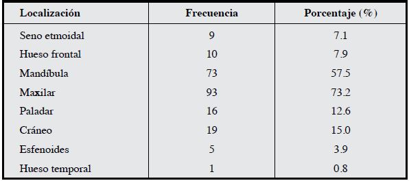 La revisión sistemática de Baracaldo y colaboradores (127 pacientes con osteítis fibrosa severa y compromiso facial), estableció que el maxilar y la mandíbula son las localizaciones más frecuentes en cara de estas lesiones 11 (Tabla 1).
