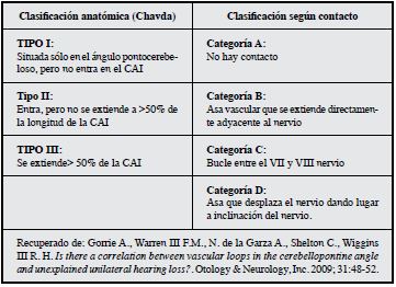 Con la RMN cerebral es posible identificar detalles finos, tales como asas vasculares en el CAI 10,11, de igual forma a partir de ella es posible visualizar estructuras vasculares y neuronales en el ángulo pontocerebeloso y determinar la relación entre el nervio vestíbulococlear y la vasculatura a su alrededor 8. En la Tabla 2 se observa la clasificación de las asas vasculares. Aproximadamente en 9% de los casos, las asas vasculares de la AICA se extienden más de 50% de la longitud del CAI 10 y 12.3 % se producen dentro del CAI según estudios postmortem 11. Los principales síntomas ocasionados por una asa vascular de la AICA son acúfenos (65%), con una incidencia de 7-12% en la población general, y cuya forma de presentación en su mayoría es pulsátil 10.