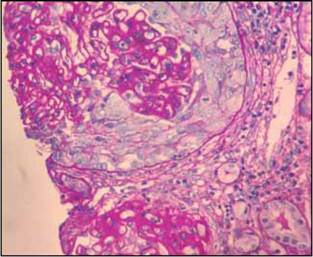 Ante la evidencia de componente agudo necrosante de proliferación extracapilar, se decidió iniciar tratamiento con metilprednisolona 500 mg/día por tres días y ciclofosfamida endovenosa 500 mg/m2 SC, la paciente evolucionó favorablemente, sin deterioro de la función renal y con mejoría de la proteinuria, egresó en manejo con ciclofosfamida según recomendaciones EUVAS el cual completó satisfactoriamente sin efectos adversos. Continuó terapia de mantenimiento con azatriopina y tras un año del diagnóstico, la paciente permanece en remisión parcial, con creatinina de 0.82 mg/dL, proteinuria de 24 horas de 2.4 g y albúmina de 4 g/dL.