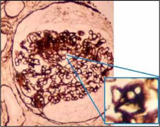 Por otro lado, la evidencia histopatológica de proliferación de células epiteliales viscerales o parietales en el espacio de Bowman se conoce como proliferación extracapilar. Cuando el daño glomerular es muy severo, se asocia con ruptura de la pared capilar o de la cápsula de Bowman lo que permite el ingreso de proteínas plasmáticas y material inflamatorio al espacio de Bowman, configurando una forma de crescencia o medialuna, hallazgo que generalmente implica un deterioro acelerado de la función renal en el contexto clínico de una glomerulonefritis rápidamente progresiva, generalmente asociada a vasculitis, enfermedad de Goodpasture o a otras glomerulonefritis agudas y severas de cualquier otra etiología 5.