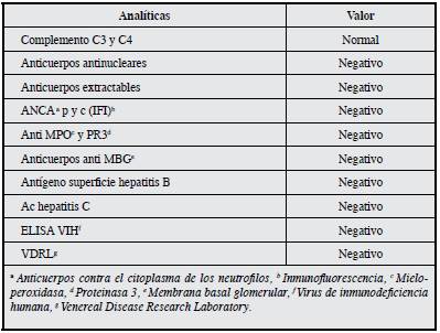 En busca de etiología secundaria, se avanzó en estudios inmunológicos con C3 y C4 normales, ANAs negativos, ENAs negativos, ANCA p y c negativos, Anti MPO y PR3 negativos, anticuerpos contra membrana basal glomerular negativos. No cumplía criterios para lupus eritematoso sistémico. Así mismo, se descartó razonablemente proceso infeccioso, con perfil viral para hepatitis B, hepatitis C, VIH y sífilis negativo (Tabla 1) y sin antecedentes epidemiológicos para considerar estudio de malaria.