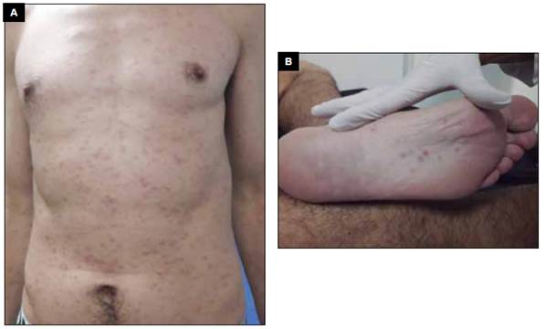 Presentó cuadro de dos semanas de exantema generalizado en tronco y extremidades sin prurito; al examinar, siempre con guantes por riesgo biológico de infección, se observan lesiones maculo-papulares simétricas generalizadas que suelen comprometer plantas/palmas y persisten a la digitopresión; en la imagen se observan sifílides en tórax, antebrazos, abdomen y planta izquierda. Evolución de VDRL: inicial 1:512 diluciones (01/02/17), primer mes pos-tratamiento 1:256 (29/03/17), tercer mes 1:64 diluciones (19/05/17).