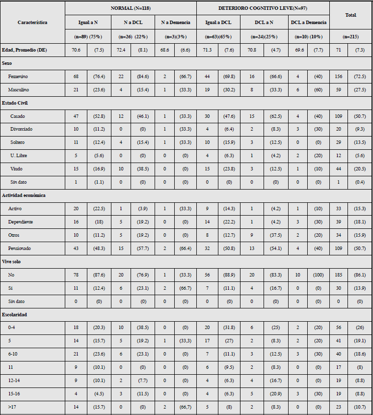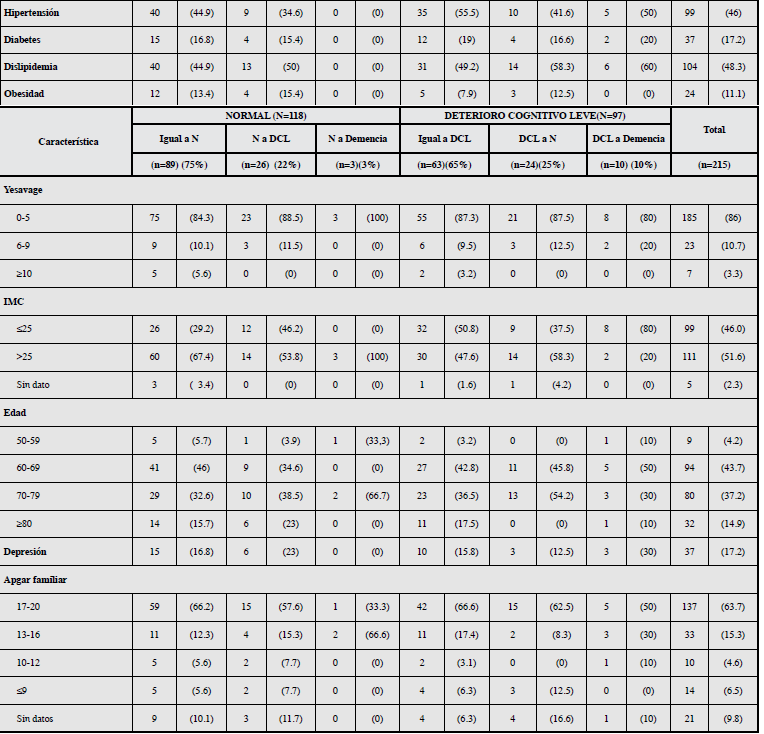 Quienes progresaron de un estado cognitivo normal a DCL se caracterizaron por tener baja escolaridad (primaria incompleta), un apgar familiar entre 13 y 16, dislipidemia y un rango de edad principalmente entre 70 y 79 años. Los sujetos sin cambio en el estado cognitivo se caracterizaron por ser en su mayoría mujeres con secundaria incompleta y tener un buen apgar familiar entre 17-20.
