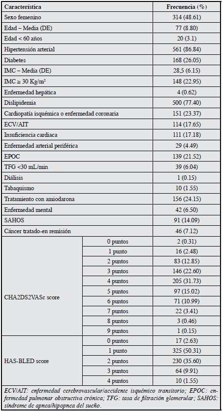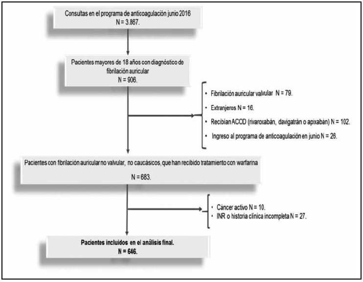 En 11 ciudades de Colombia se realizaron 3867 consul tas a pacientes anticoagulados con diferentes diagnósticos y esquemas terapéuticos durante el mes de junio de 2016. Eran adultos con fibrilación auricular 906, a quienes se les aplicó los criterios de inclusión y exclusión y finalmente se obtuvo un número de 646 participantes (Figura 1). Los pacientes fueron seguidos durante un periodo mínimo de nueve meses y un máximo de tres años.