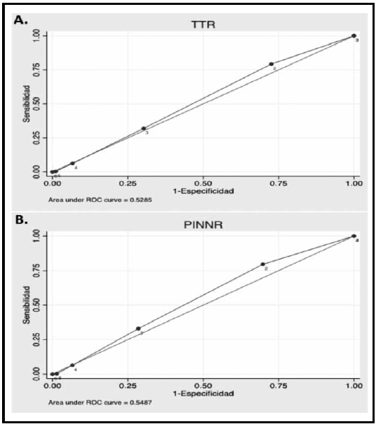 Se realizó una prueba chi cuadrado para comparar la fre cuencia de pacientes con pobre control de la anticoagulación entre el grupo con SAMeTT2R2 score ≤2 versus >2. Se halló diferencia significativa entre el grupo con un score menor o igual a 2, cuando se empleó el método PINNR (p 0.004) con mejor anticoagulación que no tuvo diferencia estadística con el TTR. Se observaron áreas bajo la curva cercanas a 0.5 (TTR=0.5285 PINNR=0.5487) indicando falta de dis criminación del SAMeTT2R2 para predecir mal control de la anticoagulación (TTR/PINRR <=65%) (Figura 2).