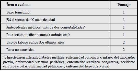 Limitaciones: El estudio fue de diseño retrospectivo y tiene las limitaciones propias de este tipo de estudios. No hay suficientes datos de una cohorte de caucásicos para evaluar su comportamiento en un ambiente latinoamericano, pero será difícil obtener esta información dada la baja prevalencia de esta población en nuestro medio. No tenemos el registro de la información sobre la frecuencia y magnitud de los cambios en la dosis de warfarina, el número de hospitaliza ciones que presentaron los pacientes y las complicaciones del tratamiento para hacer su correlación con la puntuación. Tampoco se analizaron otras variables que pueden influir en la calidad de la anticoagulación ni se recopiló datos sobre otras posibles variables de confusión como la distancia de las clínicas de anticoagulación. La aplicabilidad de nuestros resultados a otras poblaciones, con variaciones étnicas, culturales o de tratamiento, es a priori limitada y debe ser abordada en otros estudios.