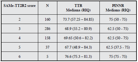 Todos los pacientes por ser no caucásicos tenían una puntuación mínima de dos puntos que son los otorgados por tener esta característica, por lo que el punto de corte para correlación con mala calidad de la anticoagulación, fue mayor de dos puntos. El 75.23% de los participantes tenían una puntuación mayor de dos puntos. El TTR pro medio calculado por el método de Rosendaal fue 67.7% con valores que oscilaron entre 0 y 100%. El PINNR promedio fue 63.6%. El percentil 5 para el TTR fue 30.66% y para el PINNR fue 25%. Más del 50% de los participantes tenían un control adecuado de anticoagulación (TTR/PINNR >65%). Inicialmente se realizó un análisis descriptivo calculando la mediana del TTR/PINNR por cada una de las puntuaciones del SAMe-TT2R2 (Tabla 3). No se observó que a mayor pun tuación del score, la mediana del TTR/PINNR disminuyera.