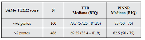 Al comparar las medianas del TTR/PINNR con el puntaje del SAMe-TT2R2 estratificado en dos grupos, ≤2 versus >2 puntos (Tabla 4) se encontró diferencia estadísticamente sig nificativa cuando se empleó el método PINNR para cada uno de los grupos del score (U de Mann-Whitney=2.22, p=0.02).