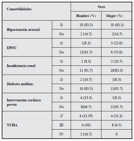 A diferencia del estudio de Chao García y colaborado res, donde la clase funcional NYHA que más predomino fue clase NYHA II, en el nuestro más de la mitad de las unidades de análisis eran clase NYHA III, y los anteceden tes predominantes fueron la hipertensión arterial, diabetes y EPOC (4).