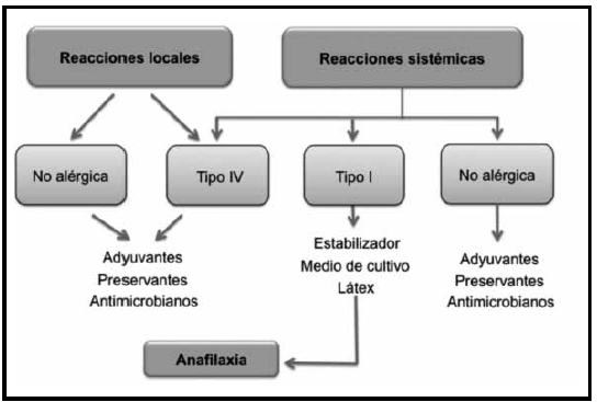 Las reacciones alérgicas a las vacunas son en su mayoría de dos tipos, las reacciones de hipersensibilidad tipo I mediadas por inmunoglobulina E, que se presentan de forma inmediata y las reacciones de hipersensibilidad tipo IV o mediadas por células, con una presentación mucho más tardía. A su vez, estas reacciones se pueden clasificar en reacciones sistémicas y locales (Figura 1) (9, 16).