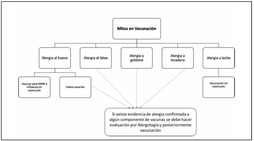 Resumen: En América Latina existen varios mitos sobre las vacunas convencionales, principalmente en pacientes con alergia alimentaria. Este artículo pretende revisar algunos de los mitos existentes, sus orígenes y proponer un abordaje clínico más adecuado. Así mismo, se propone unas directri ces acerca del manejo de los pacientes alérgicos que requieren ser vacunados. Finalmente, no se debería dejar de suministrar las vacunas a los pacientes con antecedentes de alergia alimentaria, donde la mayoría de veces se requiere el concepto del médico especialista en alergología. (Acta Med Colomb 2019; 44: 96-102).