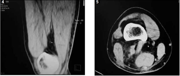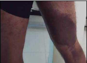 No obstante, al día siguiente reconsultó por aumento del dolor y limitación en la movilidad del miembro inferior derecho. Al examen físico se encontró un hematoma de aproximadamente 20 x 20 cm (Figura 1) en la región postero medial del muslo derecho, por lo cual se solicitaron estudios para determinar la causa del mismo, dado que el paciente era enfático en negar cualquier antecedente de trauma o esfuer zo físico reciente. Se realizó un hemograma y tiempos de coagulación que fueron normales y una ecografía de tejidos blandos (Figuras 2, 3), la cual reportó "hematoma a 10 cm por debajo del pliegue glúteo y 23 mm de profundidad, aso ciado a ruptura parcial grado III del músculo semitendinoso con un eje anteroposterior de 13 mm y un eje transversal de 31 mm conformando un espacio longitudinal del 20 cm, llegando hasta 7 cm arriba del pliegue de la rodilla y donde ese espacio está ocupado por el coágulo principal". Dado lo anterior, se decidió ampliar el estudio con una tomografía computarizada (Figuras 4, 5) que descartó cualquier proceso inflamatorio, traumático o tumoral. Por este motivo, se rea lizó una junta entre medicina interna y ortopedia, en la cual se consideró drenaje del hematoma sin indicación de una intervención quirúrgica adicional y se determinó que el único factor de riesgo identificable para la ruptura espontánea del tendón del semitendinoso era el uso reciente de quinolonas por lo cual se suspendió el manejo con ciprofloxacina y se ordenó seguimiento clínico con manejo con AINES, hielo local, terapia física y deambulación con muletas.