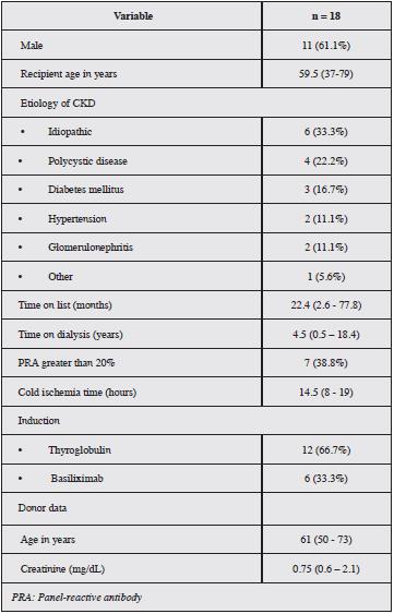 The recipients had a median age of 59.5 years (37-79). One of the transplant patients was under 40 years of age but had been on dialysis for 12 years and had decided to opt for a ECD. Among the causes of CKD, in six patients, the etiology was unknown; of the other patients, three were diabetic, four had polycystic kidney disease, two had glomerular disease, two had hypertension, and another had tubulointerstitial disease. The median time spent on the waiting list was 22.4 months (2.6-77.8); the median time spent in dialysis was 4.5 years (0.5-18.4). A total of 38.8% of the sample had a panel-reactive antibodies (PRA) greater than 20%. The donor age was 61 years (50-73), and the mean cold ischemia time was 14.5 hours (Table 1). Sixty-seven percent of patients underwent induction with thymoglobulin, and the rest received basiliximab. The main cause of death was stroke in 15 of the 18 donors.