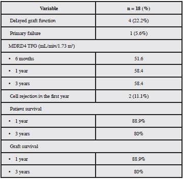 A total of 11.1% of the patients had acute cellular rejection to one year, and the average glomerular filtration rate by MDRD4 after the first and third years was 58.4 mL/min/1.73 m2 (Table 2).