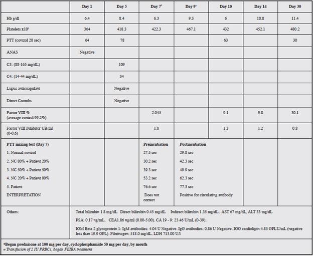 The study results suggested acquired hemophilia with moderate factor VIII deficit (2.5%). It was decided to begin treatment with prednisone 100 mg per day and cyclophosphamide 50 mg per day by mouth and broaden the study in search of a primary pathology as the cause of the secondary coagulopathy.