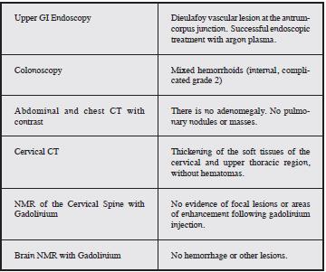 Paraclinical exams documented a hemoglobin of 6.4 g/dL, and an upper gastrointestinal endoscopy reported antral vascular malformation (Dieulafoy) which was treated with sclerotherapy and argon plasma, and proton pump inhibitor treatment was prescribed. A colonoscopy showed hemorrhoidal disease, without bleeding.
