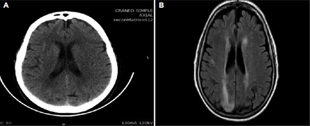 She had a history of arterial hypertension, dyslipidemia, obesity, sedentarism and episodes of bitemporal headaches which had become more frequent and intense in the previous two weeks. The headache was attributed to a migraine episode. Among her usual medications, in addition to what has already been mentioned, were losartan, hydrochlorothiazide, atorvastatin and aspirin. A simple brain CT was performed due to a suspected intracranial bleed, which was normal (Figure 1A). The lumbar puncture yielded clear cerebrospinal fluid with a pressure of 28 mmHg, 58 mg/dL of glucose, 62 mg/dL of proteins, and 3 lymphocytes/ mm3. There were no red blood cells or xanthochromia.