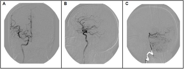 Due to this finding, cerebral angiography was performed showing areas of multifocal cerebral arterial vasoconstriction, mainly in M2 of the right middle cerebral artery and in segments V3 and V4 of the vertebral artery on the same side (Figure 2).