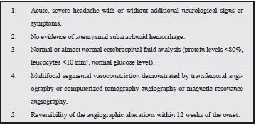 The diagnosis of RVS requires, besides the characteristic "thunderclap" headache, proven segmental vasoconstriction of the cerebral arteries and its complete or almost complete reversibility within 12 weeks of the onset of the symptoms 3. Here, the role of neuroimaging is essential, not only to prove the vasoconstriction, but also for alternative diagnoses and potential complications such as intracranial hemorrhage, vasogenic edema and ischemic stroke 3,10. Although conventional angiography has been the criterion standard for assessing cerebral vasoconstriction, non-invasive imaging modalities such as transcranial Doppler, tomography angiography (CT angiography) and magnetic resonance angiography (angioresonance) are being used more frequently 11.