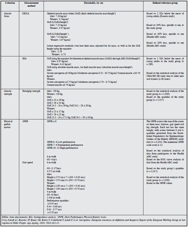 Finally, sarcopenia and frailty are known to be closely related as geriatric syndromes and may coexist. In In our population, these two entities were found simultaneously in 18.55%, a percentage similar to that found in the SABE study (17%), which suggests a possible relationship in the presence of these two conditions. However, in a study performed in the Netherlands 27, the intraindividual correlation between sarcopenia and frailty was low, possibly explained by the difference in pathophysiology, since the first is based on musculoskeletal alterations, while frailty has a complex multifactorial cause including, according to the assessment tool, emotional and cognitive elements. More studies with a larger population are needed to determine this relationship.