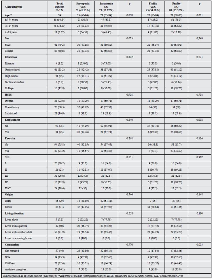 The prevalence of sarcopenia was 41.13% (51/124 patients) and of frailty was 34.68% (43/124 patients). Both conditions were found in 18.55% (20 out of 124). The population characteristics are shown inTable 1. The median age was 74 years. The distribution by sex was 50.8% women (63/124) and 49.2% men (61/124). A total of 60.5% of these individuals belonged to the contributory system, 71% were from urban areas, and 54% needed a constant companion. The prevalence of sarcopenia increases significantly with age, p= 0.038 (confidence interval, CI 1.30-2.33), as does frailty (p=0.001, CI 1.80-3.31). Altogether, 33.3% of women and 49.18% of men had sarcopenia; the gender relationship was not statistically significant. Frailty was found in 36.07% of men and 33.36% of women; the sex-frailty relationship was not significant (Table 1).