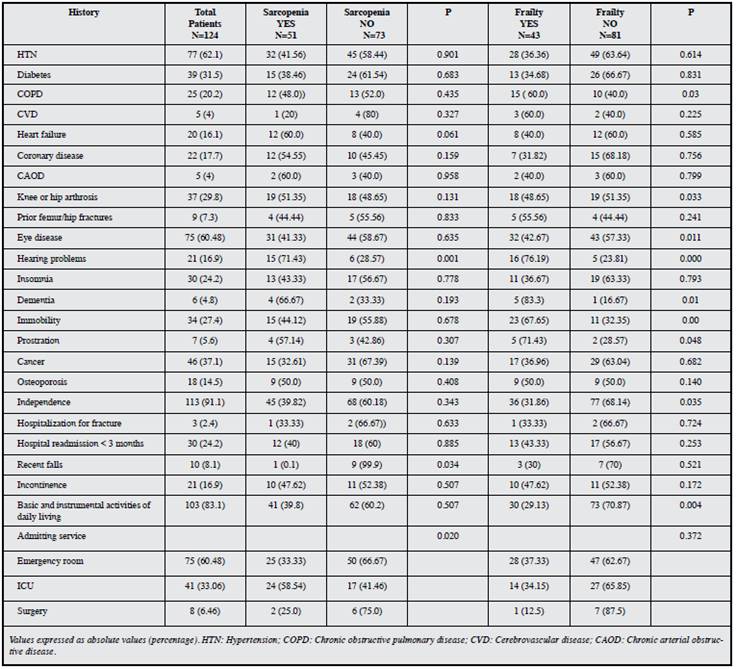 The most commonly found concomitant diseases were hypertension, diabetes and chronic obstructive pulmonary disease (COPD), none of which were significantly associated with sarcopenia. These diseases were not significantly associated with frailty, either, except for COPD which was significantly related (p=0.03 with a CI of 1.59-2.01). Altogether, 37.1% of those studied had some type of malignancy which was not significantly related to these geriatric syndromes; 24.2% of the patients had been hospitalized within the three months prior to the current admission, with no significant relationship between this condition and having or not having sarcopenia or frailty (Table 2). Eye diseases were found in 60.48% of those studied, with no significant association with sarcopenia, but significantly associated with frailty; 16.9% had auditory disorders, a condition which was significantly associated with these syndromes.