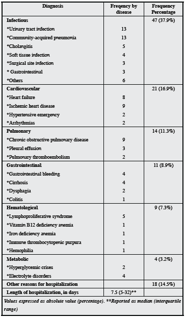 Most of the hospitalized patients were admitted through the emergency room (60.5%). The median hospitalization was 7.5 days, with a range of 1-32 days. Infectious causes (urinary tract infection and pneumonia) were the most frequent causes of hospitalization (Table 3).